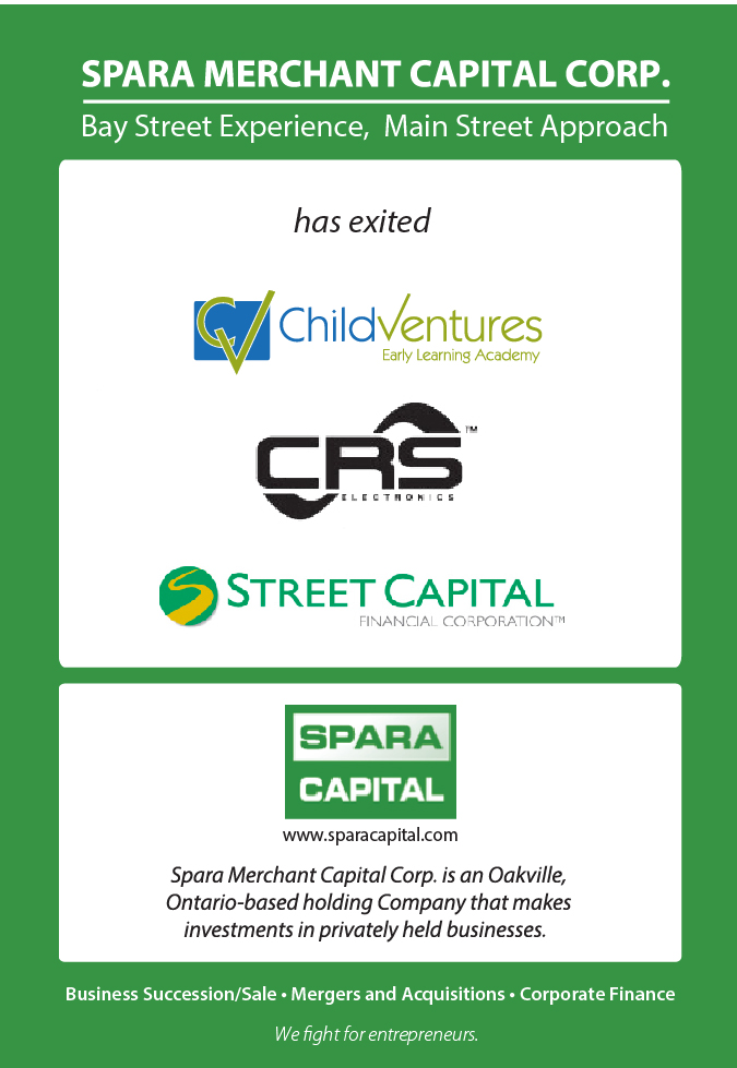 Spara Merchant Capital Corp has successfully exited: CRS Electronics, ChildVentures and Street Capital. Share this postShare with FacebookShare with TwitterShare with Google+Share with PinterestShare with LinkedIn
