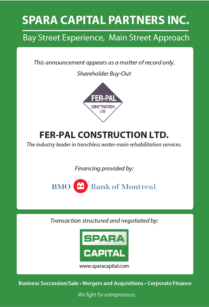 Fer-Pal is a highly successful Toronto, Ontario-based provider of trenchless water-main rehabilitation services to municipal governments. With revenues approaching $50 million, the Company (North America’s largest provider), leads its industry in terms of innovation capability, quality, and reputation for service. Due to the crumbling underground infrastructure throughout North America, and the significant cost and social advantages of using trenchless (“no-dig”) technology, the continued growth prospects of the Company are tremendous.
