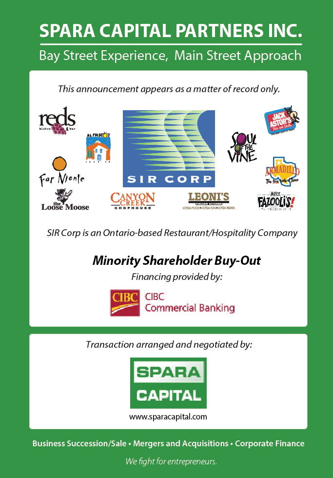 Spara Capital Partners Inc. advised and assisted SIR Corp with the purchase of the minority interests in its various restaurant properties and negotiated and arranged the requisite financing. Spara Capital Partners’ role included negotiating the purchase of over 65 minority partnership interests, and structuring and arranging the appropriate debt capital with CIBC Commercial Banking. This important transaction provides the foundation for SIR Corp’s future growth objectives.